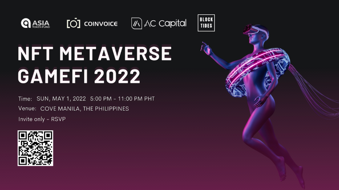 Brace yourselves as four prominent outstanding global media and capital AC Capital, CoinVoice, Asia Token Fund & Block Tides bring the first-ever largest NFT, GameFi, and Metaverse event in Southeast Asia. NFT, GAMEFI, AND METAVERSE 2022 is set to debut this May 1st on the largest indoor beach club in the capital region of the Philippines Cove Manila with 2000+ whitelist interest and 1000 attendees.